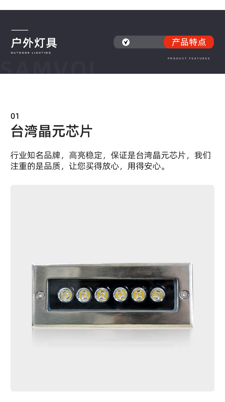 LED地埋灯是以超高亮LED为光源,以LED恒流驱动为驱动方式的新型埋地装饰灯。广泛用于广场、户外公园、休闲场所等户外照明,以及公园绿化、草坪、广场、庭院、花坛、步行街装饰,瀑布、喷泉水底等场所夜景照明,为生活增添光彩。